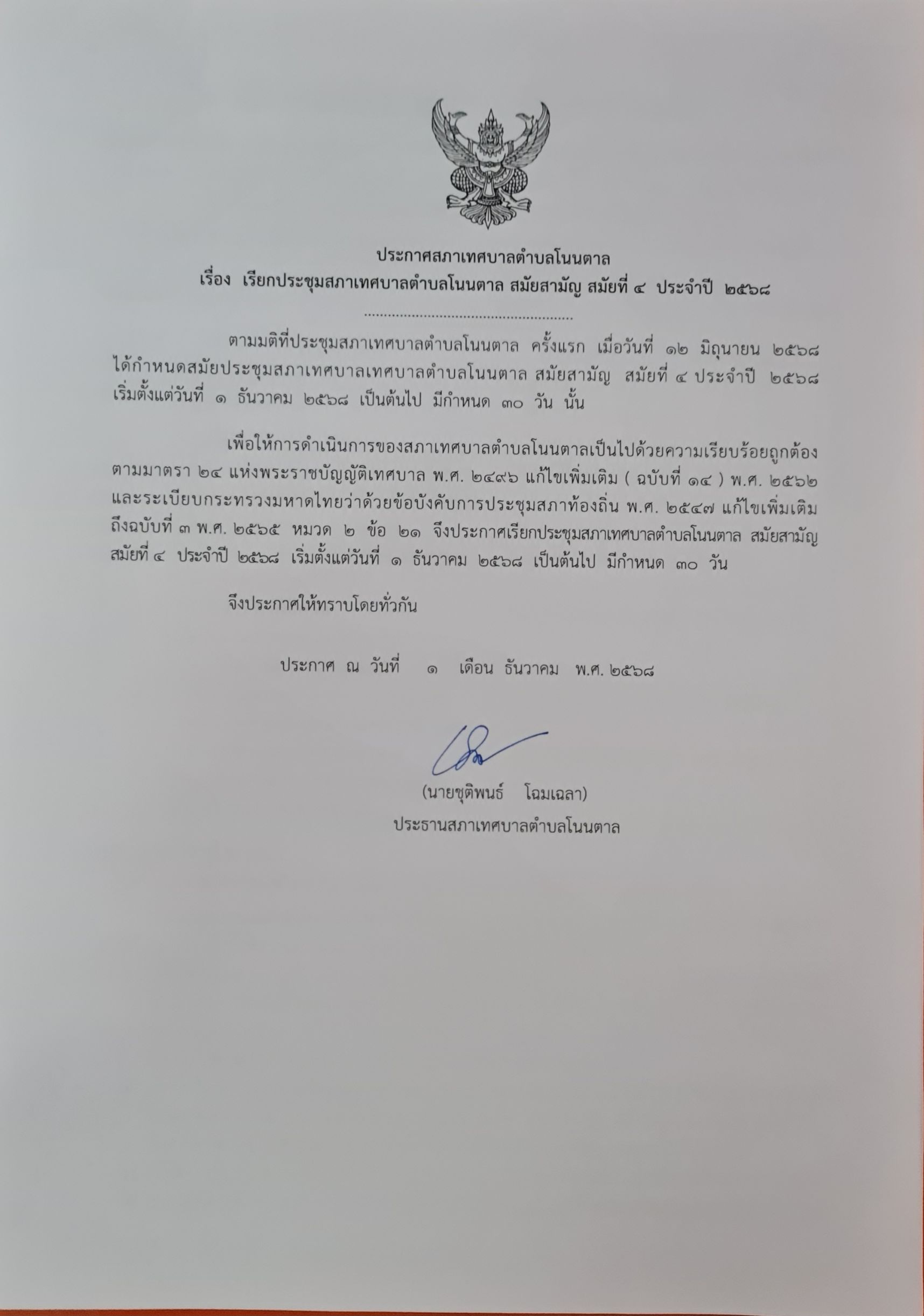 เรียกประชุมสภาเทศบาลตำบลโนนตาล สมัยสามัญ สมัยที่4 ประจำปี 2568