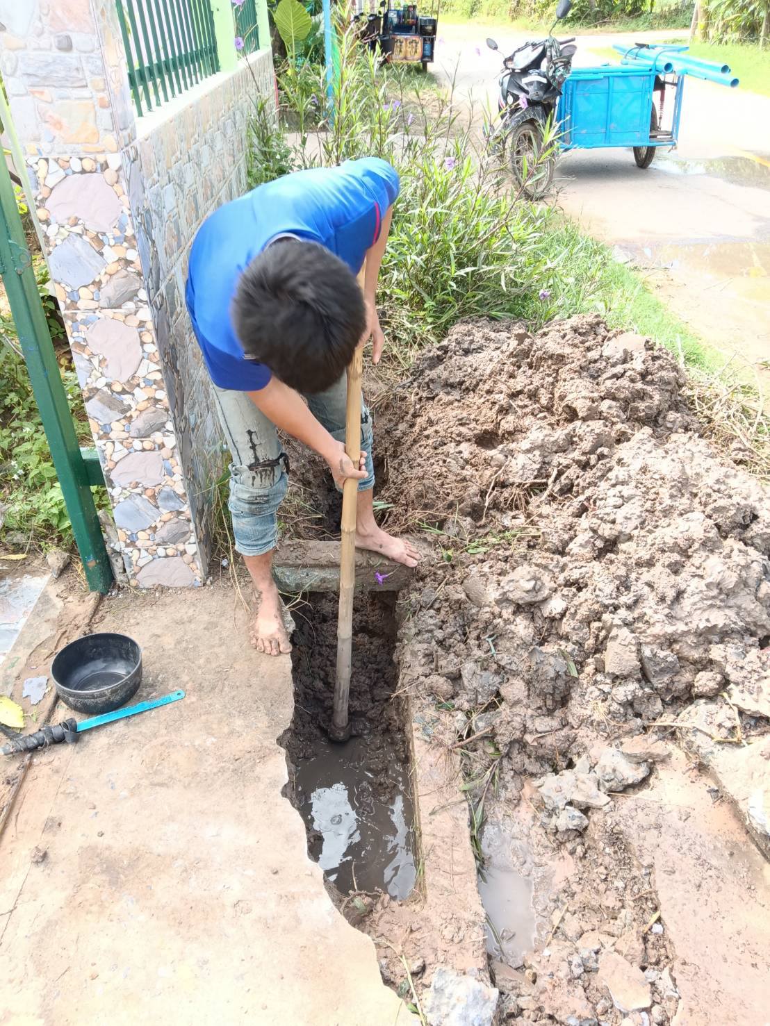 ????เข้าแก้ไขท่อเมนส่งน้ำประปาที่แตกใต้พื้นคอนกรีตบริเวณหน้าบ้านท่านกำนันท่านเก่า บ้านหนองบัว หมู่ที่ 1